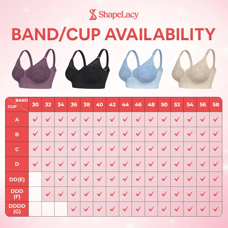Available in cups A–G and band sizes 30–58! Our top lingerie designer's meticulous size chart, combined with our flexible fabric, promises the fit you desire.